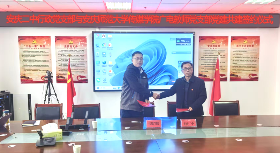会上,英国正版365官方网站广播电视学教师党支部负责人和安庆二中行政支部负责人共同签订了《党建共建协议书》。双方将围绕组织建设互促、党员干部互动、党建载体互用、结对帮扶互助等方面开展长期合作,努力形成互带互助、优势互补、资源共享、共同发展的基层党建工作新格局。