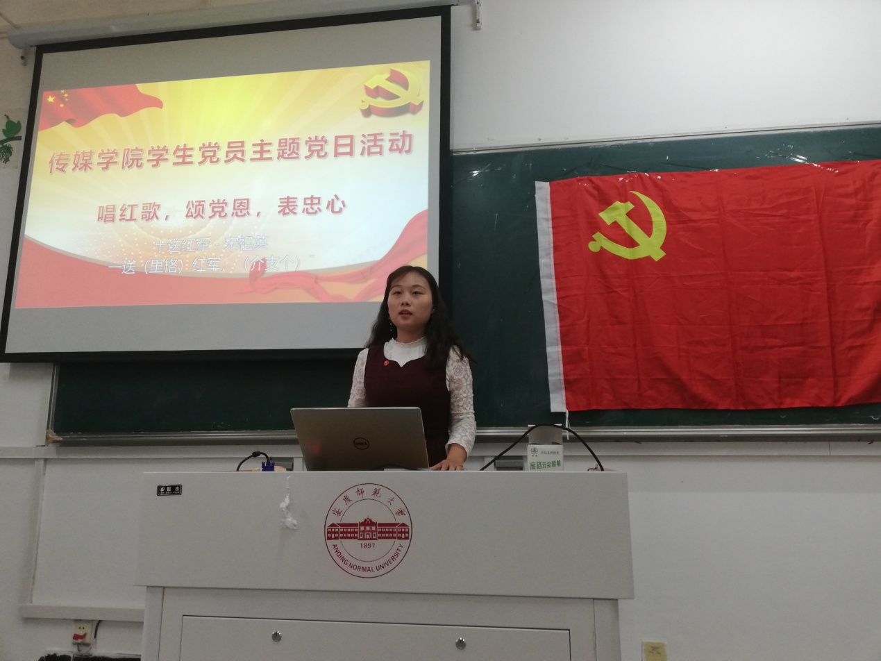 本次活动共分为四个部分,分别为“说红歌创作背景”、“集体唱红歌”、“谈唱红歌感受”和“学习《中国共产党纪律处分条例》”。活动的第一部分为“说红歌创作背景”,由学院党总支副书记张万茂为大家介绍《十送红军》歌曲创作的历史背景。他以简明的话语解说了这首歌曲创作背后的革命形势,再现了当时红军与百姓离别时的场景,让大家感受到红军深受人民群众爱戴的同时,深刻体会到《十送红军》背后的感人故事。