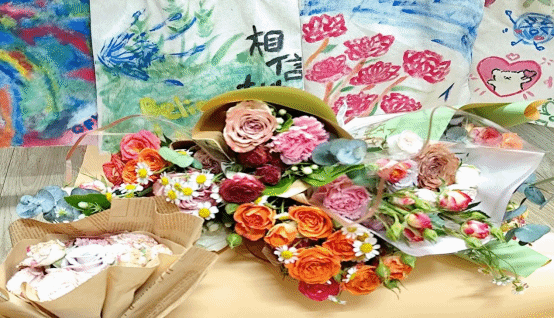 在活动筹备期间,各班班委提前了解学生们喜欢的花类品种,有茉莉、康乃馨、卡布奇诺、热情泡泡……负责人们购买对应花束后稍作修剪,避免枝刺划伤学生。活动开始前,负责人将花束、颜料、彩纸、帆布包等分类放置在桌上。
