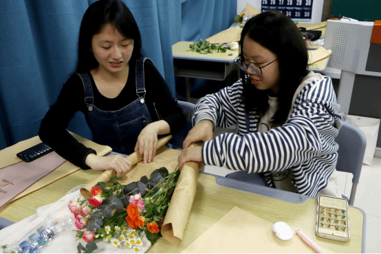 “在学会色彩搭配的同时,我还学会了许多包花小技巧。”在插花活动中,新闻传播学类专业2023(8)班的张雨萌说到:“我挑选了很多品种的花朵,以白玫瑰为主,辅之以小雏菊和卡布奇诺等,和同伴一起扎了一大束花并且上台分享展示了我们的作品。”
