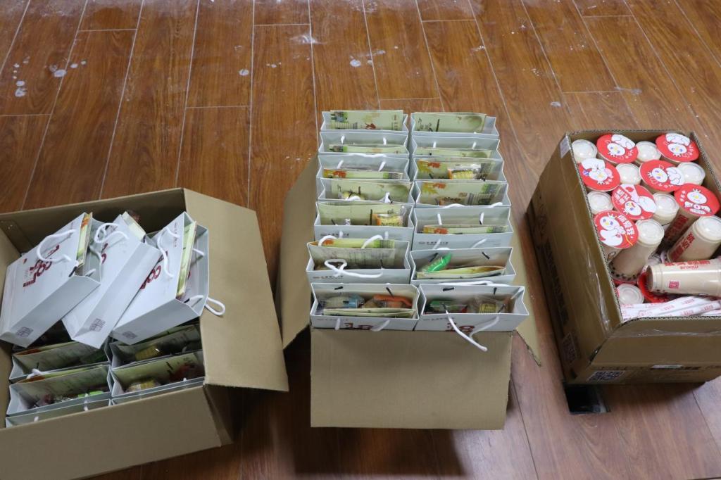 每人一杯奶茶,两块绿豆糕,四个不同口味的月饼,以及一本手写了“欢迎来到美丽的双龙湖畔,祝愿你度过快乐的四年大学时光”“开心快乐每一天,保持阳光心态”“要心中有梦,敢于追梦”等寄语的笔记本。