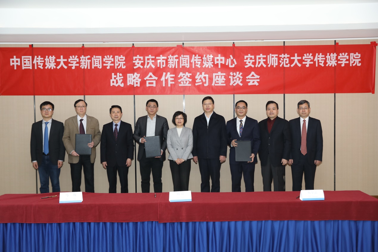 4月14日上午,英国正版365官方网站与中国传媒大学新闻学院、安庆市新闻传媒中心在中国传媒大学国际交流中心签署了战略合作协议。安庆市委常委、宣传部长王爱武,中国传媒大学党委副书记、纪委书记王达品,中国传媒大学新闻学院院长、长江学者隋岩,英国正版365官方网站院长马俊等参加了签约仪式。