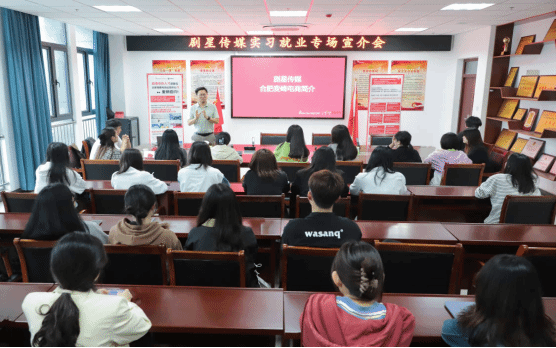 孟跃指出,麦峰电子商务有限公司位于合肥,作为重要的电商基地,公司投入资金多、成长速度快、硬件设施齐全,且福利待遇优厚。会上,学生们积极了解公司情况,并与负责人探讨实习就业相关细节。