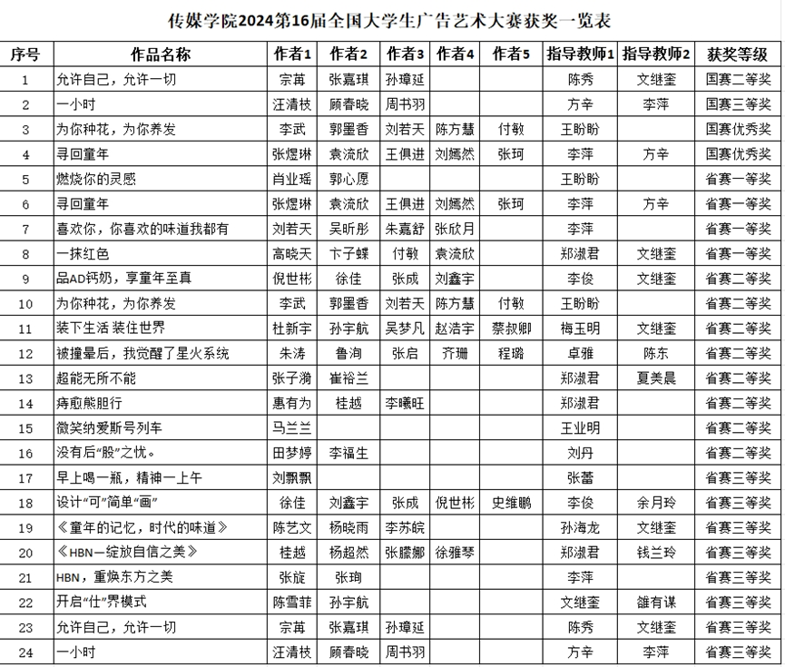 日前,2024第16届全国大学生广告艺术大赛评审结果出炉。我院学子在本届大赛中共获奖24项,其中国赛二等奖、三等奖各1项,优秀奖2项;省赛一等奖4项,二等奖8项,三等奖8项,获奖数量与质量较往年均有较大的提升。