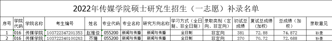 根据学校研究生招生工作领导小组决定,我院新闻与传播专业调控增加2名招生指标,根据《英国正版365官方网站2022年硕士研究生招生复试录取办法》《英国正版365官方网站学院2022年硕士研究生招生复试录取工作实施细则》等文件要求,现决定按成绩递补拟录取2名考生,现公示如下,公示时间从2022年4月20日开始,公示为期10天。如有问题,请及时向学校研究生复试录取督查组反映,电话:0556-5300053,邮箱:jiwei@aqnu.edu.cn。