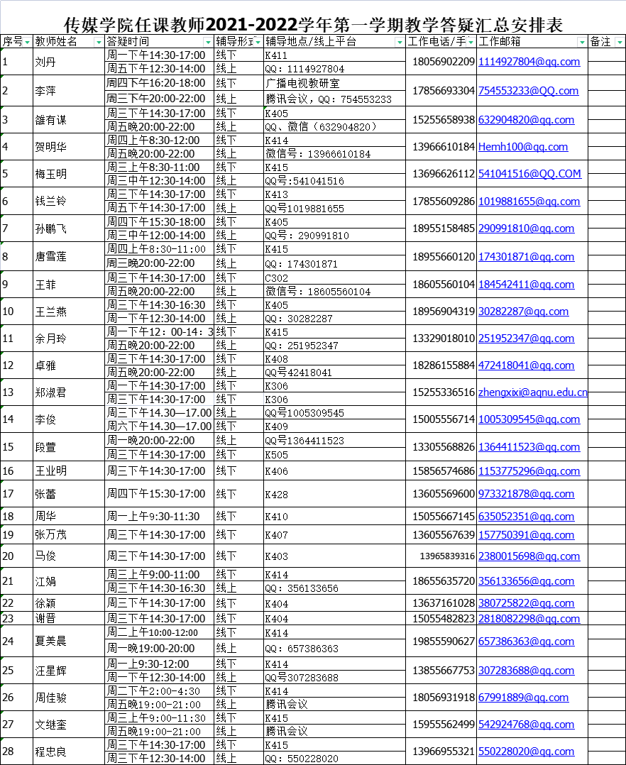 英国正版365官方网站任课教师2021-2022学年第一学期教学答疑汇总安排表