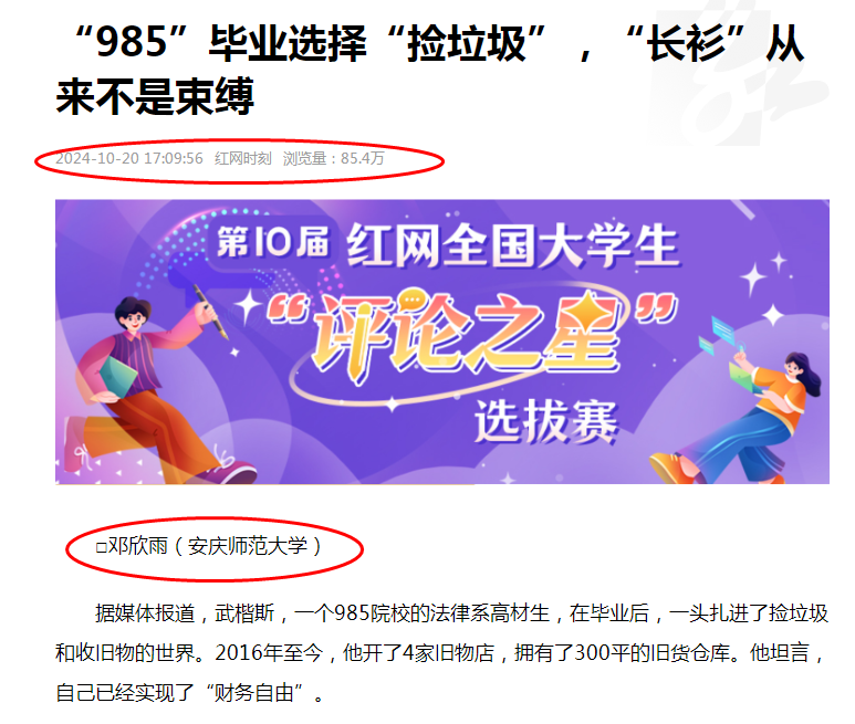 本学期,《新闻评论》课程组全体教师坚持以学生发展为中心,秉承OBE教学理念,采用线上线下混合教学方式,进一步拓展了校媒合作平台。教师鼓励学生多写作,多发表。通过一学期的改革与实践,取得显著效果,学生公开发表的新闻评论作品数量有了显著增加,作品质量也有稳步提升。2023级新闻传播类5班邓欣雨同学一篇题为《985毕业选择“捡垃圾”,“长衫”从来不是束缚》的新闻评论作品发表于红辣椒频道后,累积获得获得85万+以上的阅读量。截至目前,红辣椒频道官方微信公众号已形成了英国正版365官方网站专辑,共收录作品17篇。