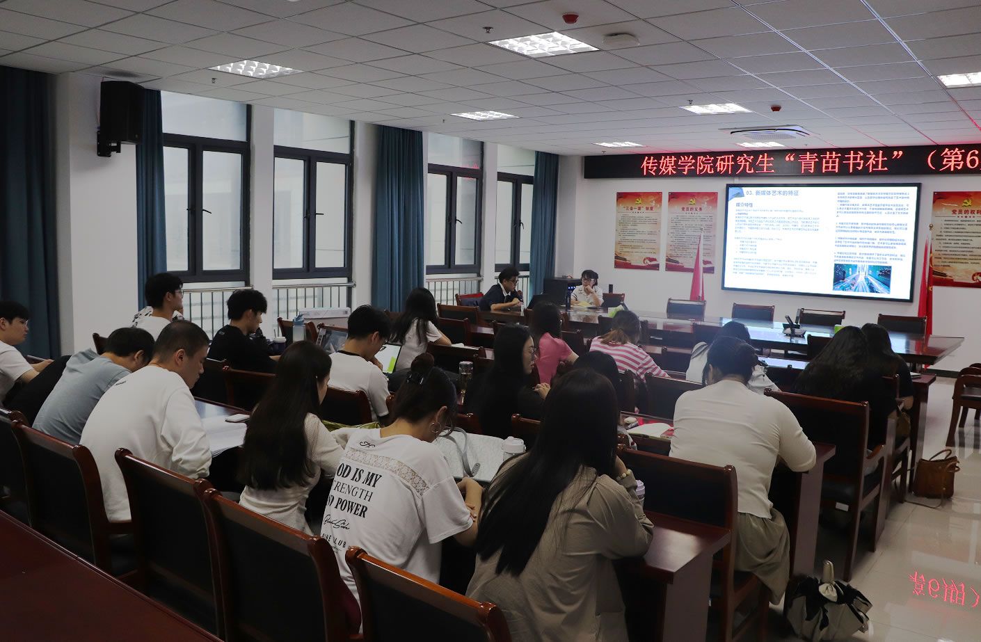 9月20日下午,英国正版365官方网站在K408开展“青苗书社”第六期活动。本期读书会的阅读书目为《新媒体艺术》和《千古文人侠客梦》,汇报人是22级新闻与传播专业研究生陈龙和赵维俊两位同学。读书会由研究生导师卓雅副教授主持,22级全体研究生参加。