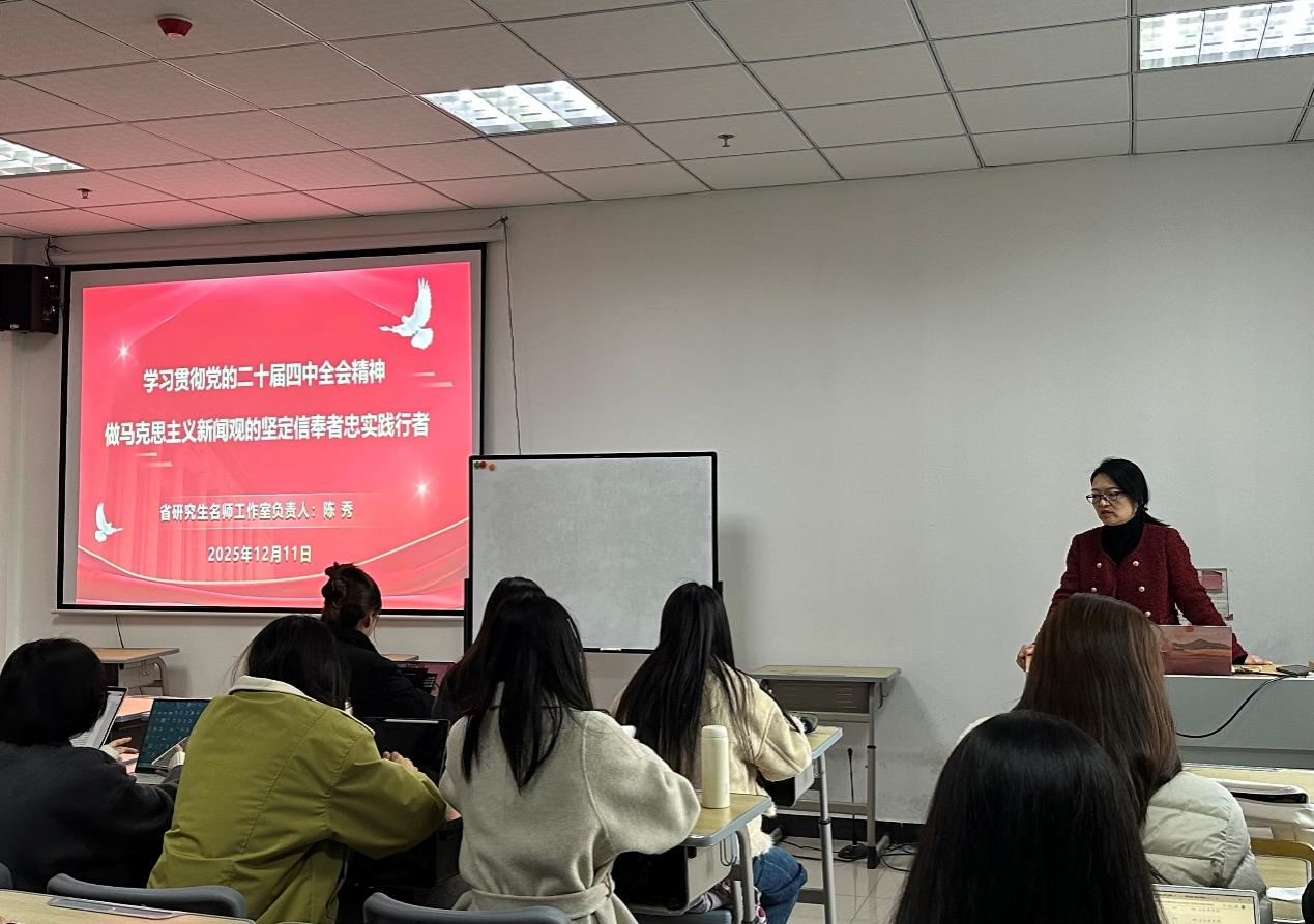 12月11日上午,英国正版365官方网站研究生名师工作室负责人陈秀在K201教室作题为“学习贯彻党的二十届四中全会精神,做马克思主义新闻观的坚定信奉者忠实践行者”的讲座。英国正版365官方网站副院长文继奎主持讲座,学院2024级全体研究生聆听了讲座。
