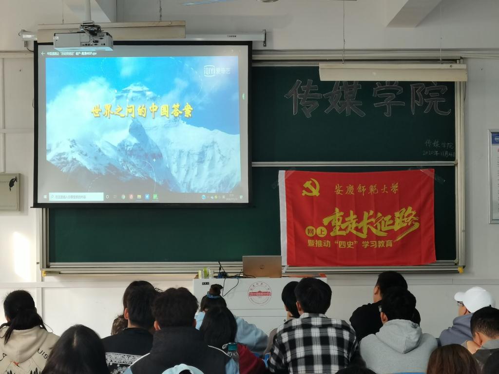 “大家都知道‘四史’有哪些内容吗?”活动负责人2018级网络与新媒体一班的王龙龙通过四个短片,介绍了党史、新中国史、改革开放史及社会主义发展史,加深了同学们对“四史”的认识。