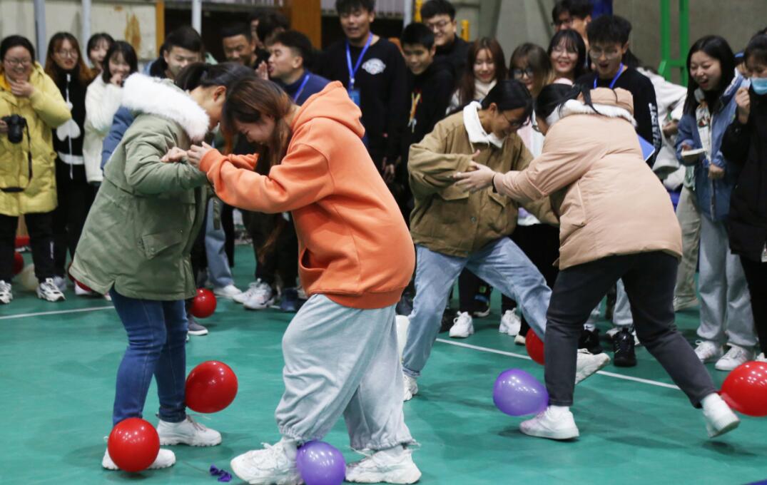 摸石过河项目考验参赛选手的灵活性和比赛技巧,选手在确保脚不落地的前提下,凭借3个塑料板到达终点。袋鼠跳项目要求每位参赛选手双腿套上袋子,蹦向终点。踩气球比赛时,每位参赛选手的脚踝处绑上两个气球,在规定区域内气球不被踩爆、坚持到最后的获胜。独特的比赛形式引起了学生们的热情欢呼,场下观众掌声、欢呼声接连不断。