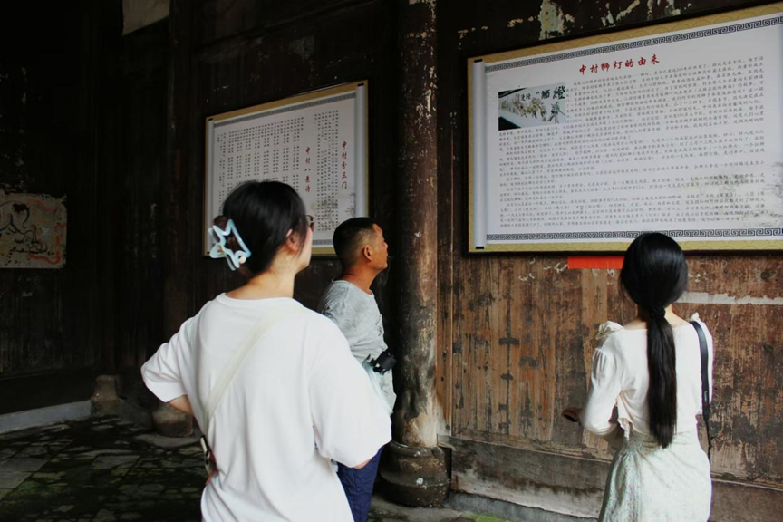 一件件戏服精美绝伦、一股股刺绣惟妙惟肖、一阵阵鼓声雄浑激荡......走进中村舞狮灯展览馆,展厅中的舞狮非遗展品精彩纷呈,村支部书记吕彦水带领实践团成员进行参观,在村书记的介绍中,成员们了解到舞狮灯距今已有200年的历史,传达了村民对幸福、和谐生活的热切期盼。