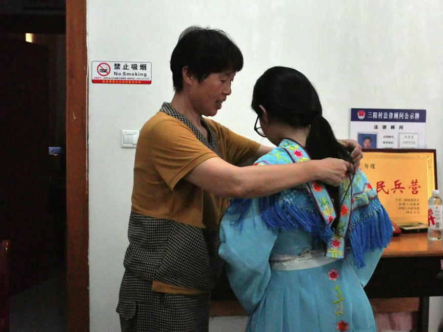 图为村干部潘永红为实践团成员穿上打秋千服装
