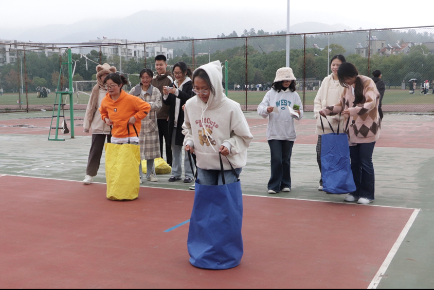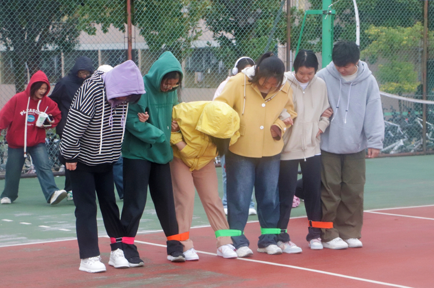 各支队伍在比赛中进行比拼,现场气氛活跃,其中布条转圈圈、六人七足、数学袋鼠跳等比赛项目广受欢迎。哨声一响,学子们在响亮的口号声中大步向前,奋力追赶。新闻传播学类专业2024(4)班汪平安说:“在六人七足这个比赛项目中,我感受到了团体的力量,我们一起喊出‘一二一’的口号,使得步调一致,这样走起来更加流畅。”她坦言,她很享受这次活动,在与队友的配合中完成的很顺利,既锻炼了身体,又增进了友谊。