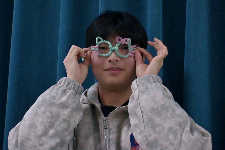 在动态游戏间隙,各小组学生利用桌上备好的彩色扭扭棒进行手工创作。伴随着翻转、折叠等一系列动作,彩色绒条在指尖化作蝴蝶、香蕉等创意造型。制作完毕,作品进入到了展示环节。新闻学专业2023(1)班的周杰凭借着幽默的“推销”,获得了“最佳展示奖”,他表示:“我在这个环节只是起到了一个锦上添花的作用,更主要的是离不开队友们的大力支持。”